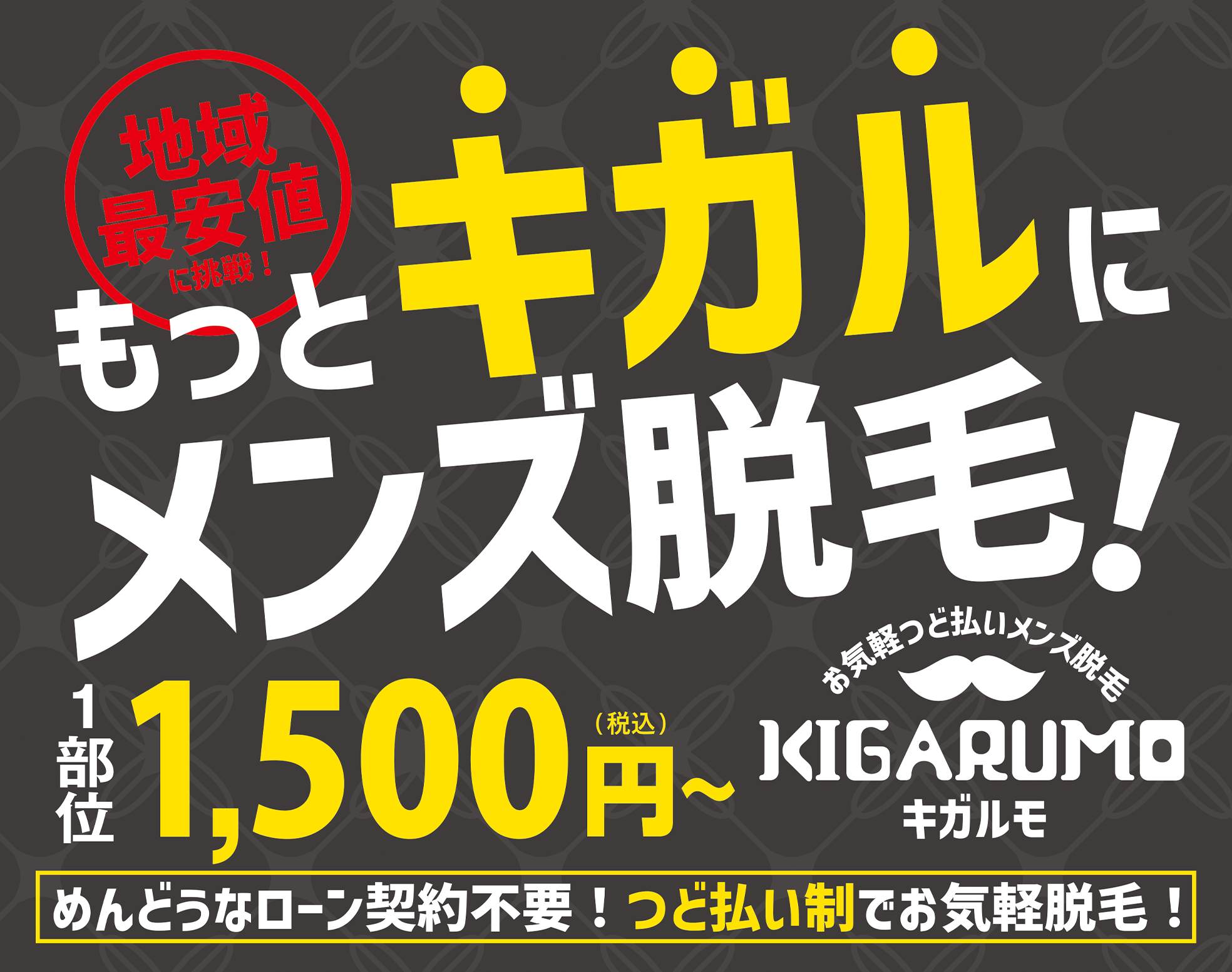 メンズ脱毛キガルモ 宇都宮店メンズ脱毛キガルモ宇都宮店は男性専用の脱毛サロン。めんどうなローン契約不要のつど払い制で1部位1500円~の地域最安挑戦。VIO脱毛や眉毛など細部施術に対応し気軽に利用できます。1回あたり料金(税込)1,500円/回〜公式サイトを見るプラン1回あたり(税込)総額(税込)回数期間都度払いパーツ脱毛(1部位)¥1,500/回---