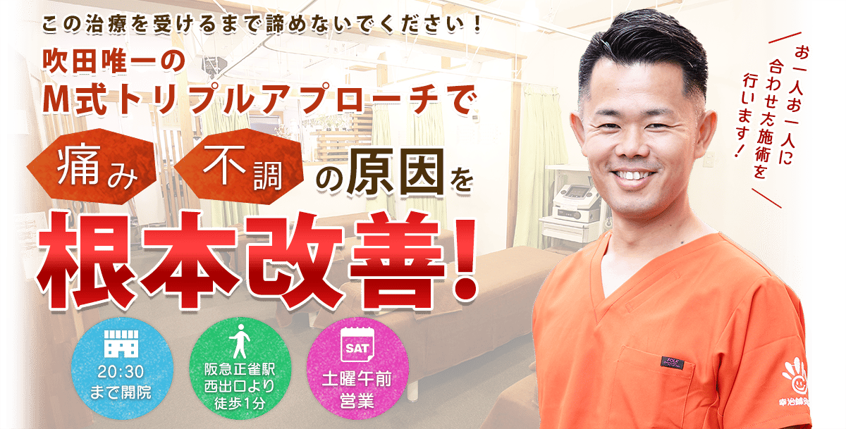 脱毛サロンMAKE 吹田市正雀駅から徒歩1分吹田市・正雀駅徒歩1分の幸治鍼灸整骨院。骨格・筋肉・筋膜・内臓・自律神経・深層筋の6方向アプローチで姿勢と痛みを根本改善し、ピラティス併設で再発予防まで支援します。20年の臨床経験と10万人以上の実績で個別プランを提供します。1回あたり料金(税込) -公式サイトを見る