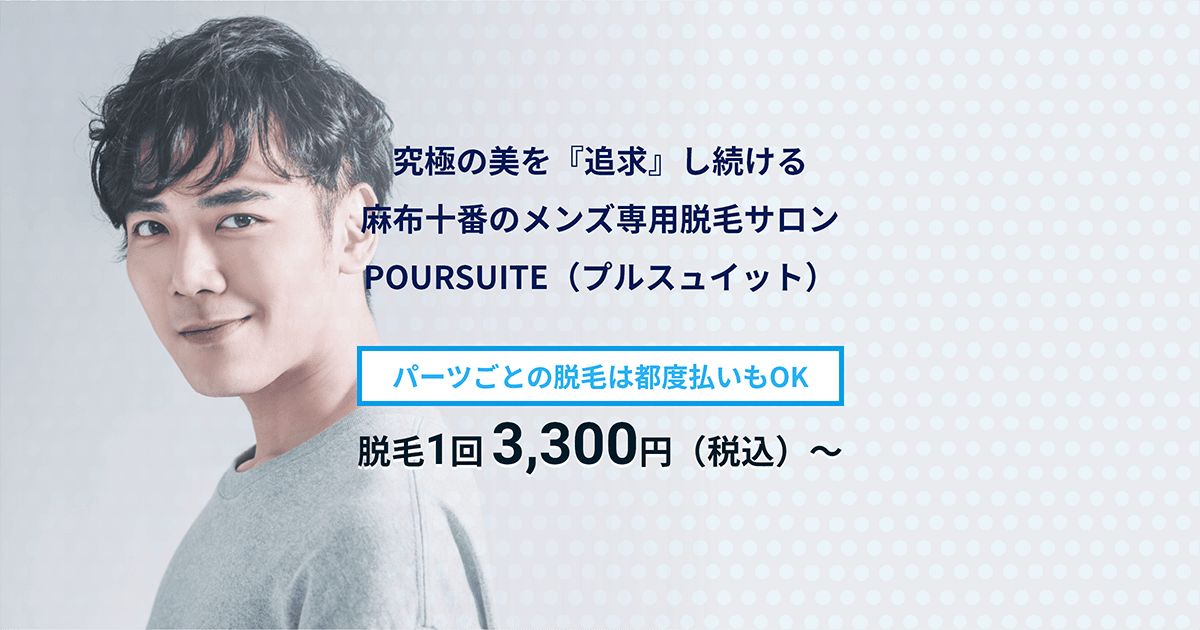 POURSUITE 麻布十番店赤羽橋駅から徒歩4分16:00~23:00麻布十番のメンズ専用脱毛サロン。麻布十番駅徒歩6分・赤羽橋駅徒歩4分。最新のIPL×SHRハイブリッド機で痛みを抑え短期効果を実現。都度払いや全身・ヒゲ・VIOコースが充実し、夜23時まで完全個室で対応します。1回あたり料金(税込)3,000円/回〜公式サイトを見るプラン1回あたり(税込)総額(税込)回数期間回数券両手(指・甲) 各(都度)¥3,000/回¥3,0001回-他9件のプランを見る