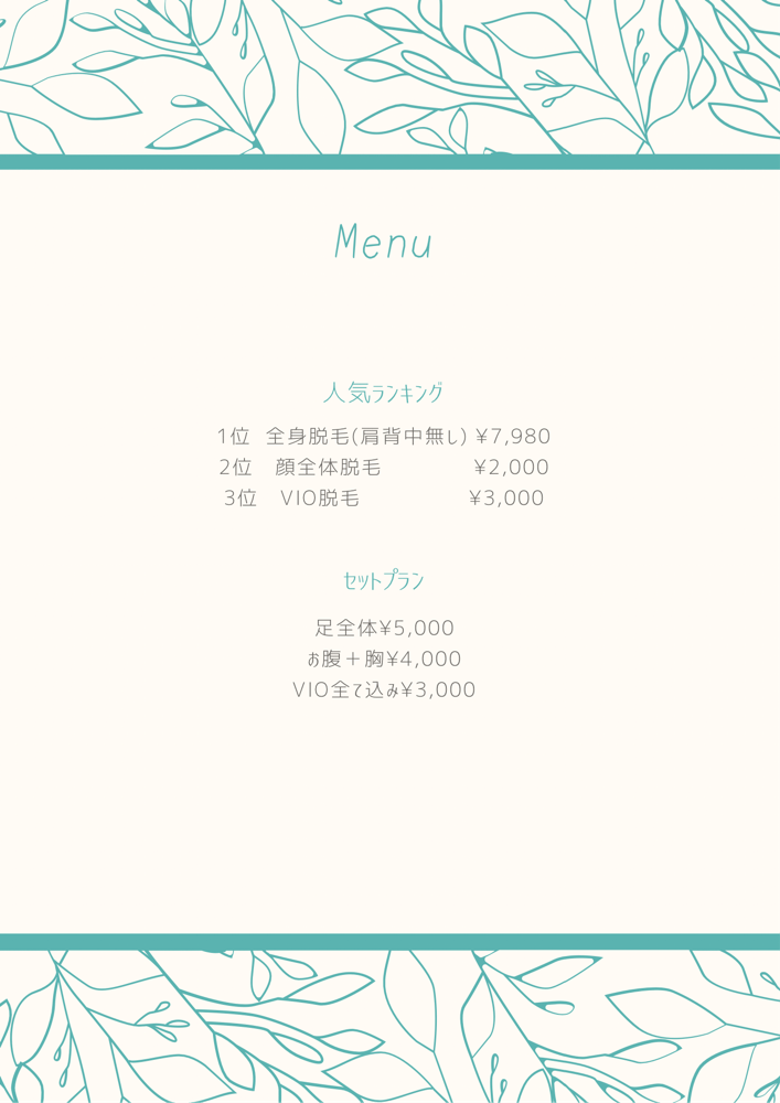 | ヒゲ脱毛・VIO 10分 | - | - | ¥5,000 | ヒゲ脱毛およびVIO向けの10分プラン。短時間での施術を想定した料金の目安です。 |
